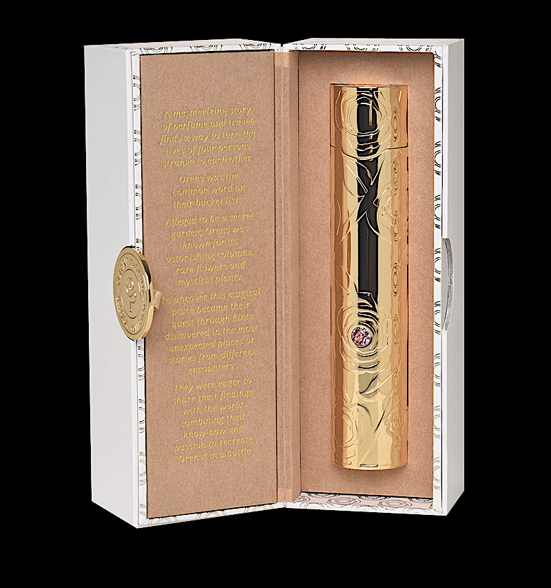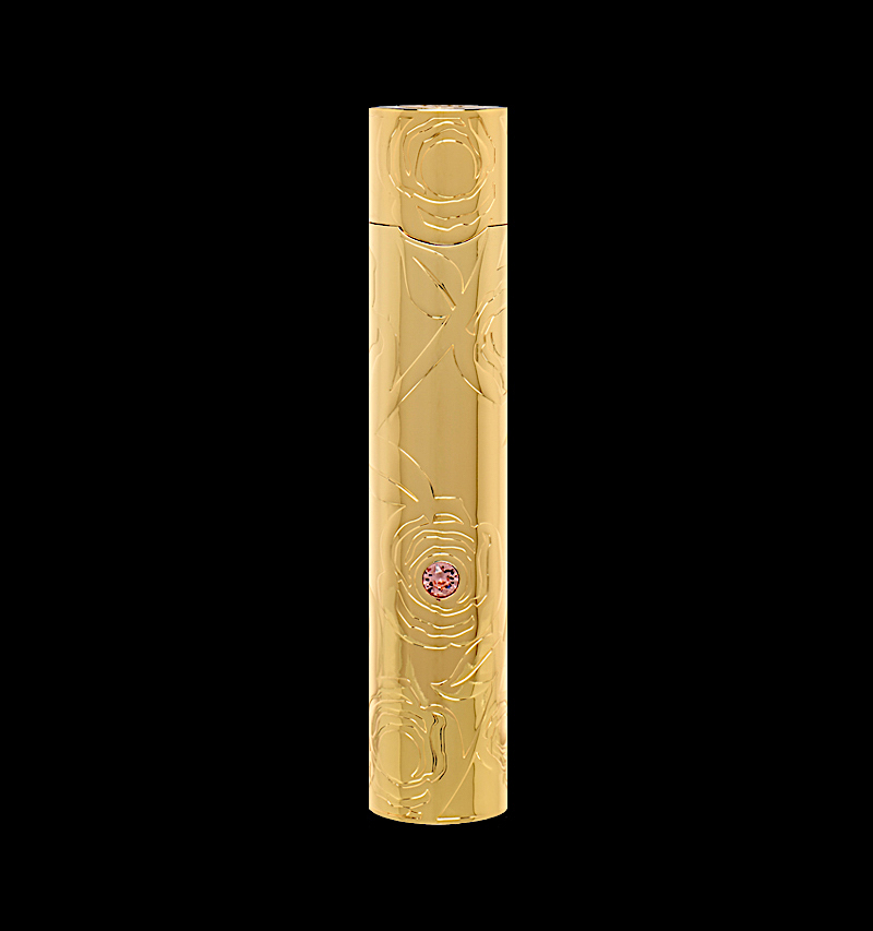Un porta profumo in zama splendidamente inciso e decorato con una pietra Swarovski. Contiene un flacone da 50ml di Eau de Parfum.